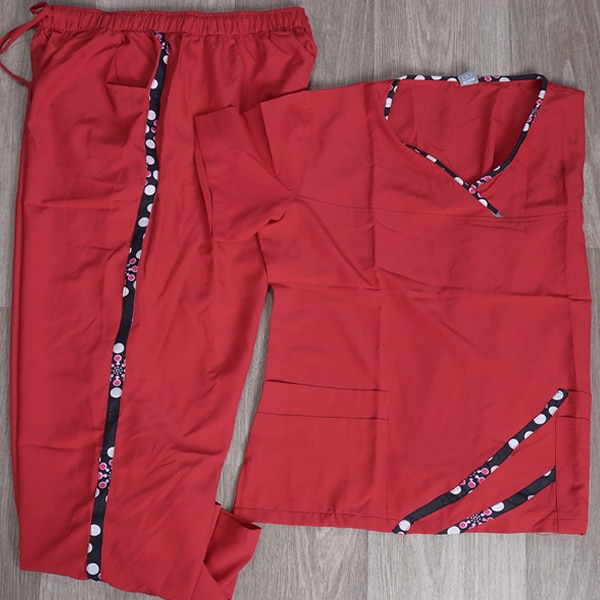 The Custom Abike Wear Scrub is a vibrant, functional, and stylish outfit made for healthcare professionals who value both comfort and confidence. Designed in a striking ruby red tone, it features a soft, breathable fabric that keeps you feeling cool throughout the day. The top offers a flattering fit with a modern neckline, smart contrast trim, and two spacious front pockets for convenience. The matching pants are fitted with an elastic waistband and accent strip detailing for ease of movement and a polished look.